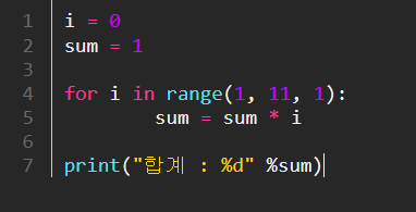 1에서 10까지 수의 곱을 구하는 프로그램을 작성하시오.